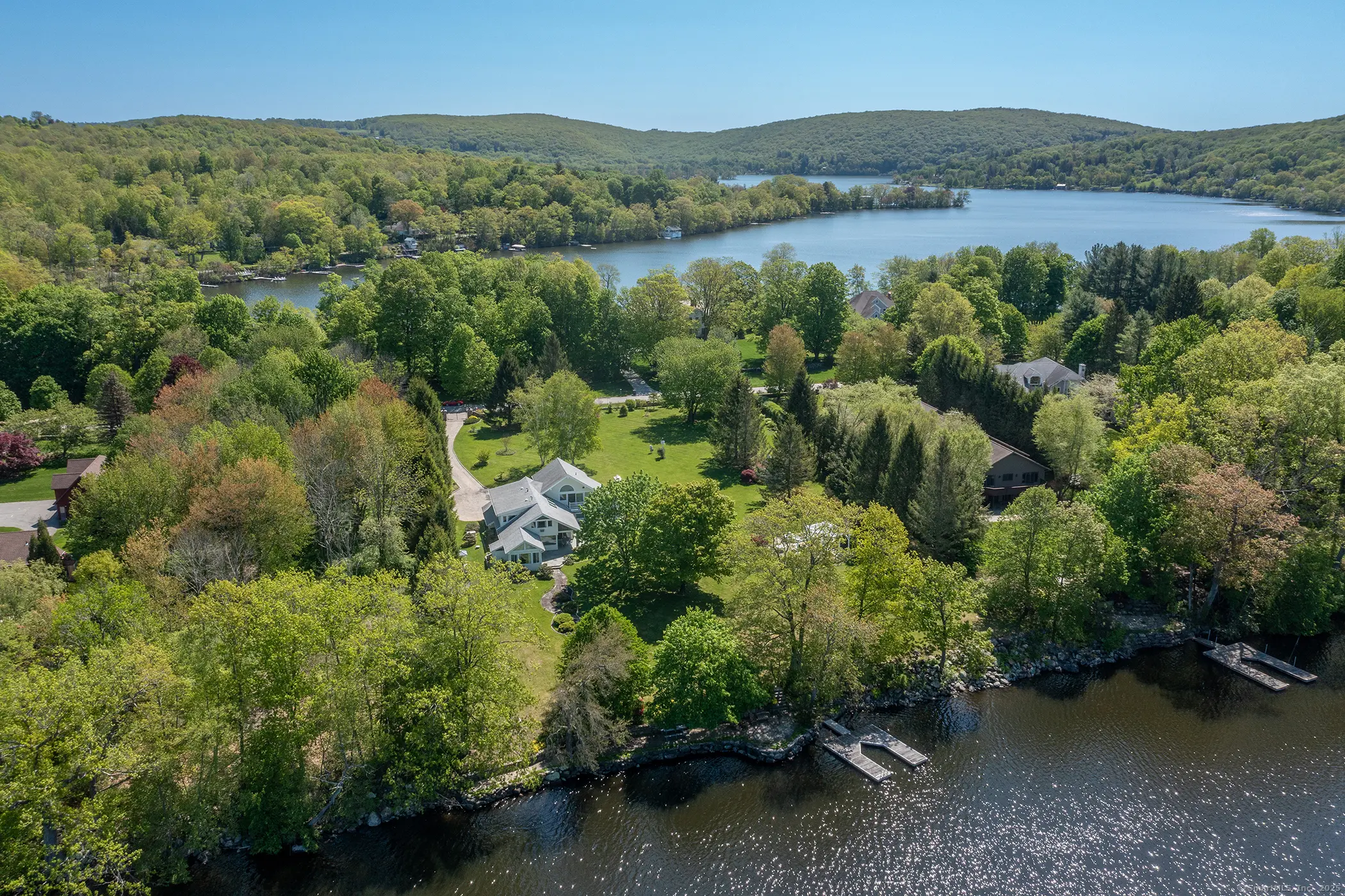 Rare Direct Waterfront Lake Waramaug 5 bedroom / 3 full & 2 half bathroom home with stunning western views on beautifully maintained double lot. Eat-in Kitchen. Vaulted Living Room with fieldstone fireplace & sliders. Vaulted Family Room with built-in bookshelves & gas fireplace. Vaulted Dining Room with gas fireplace & French doors. Covered porch. Wraparound stone terrace. Primary bedroom suite with full bath, walk-in closet & balcony. 4 guest bedrooms. Level lawn to gorgeous lakefront. Large stone deck at water's edge. New floating IPE wood dock. Outdoor cabana/shower. 2-car attached garage. Backup generator. Pergola with summer Kitchen. Screened Gazebo. Mature plantings & perennial gardens. Irrigation system. Belgian-block driveway. Gated entrance. Private. 2+ acres. Must see!