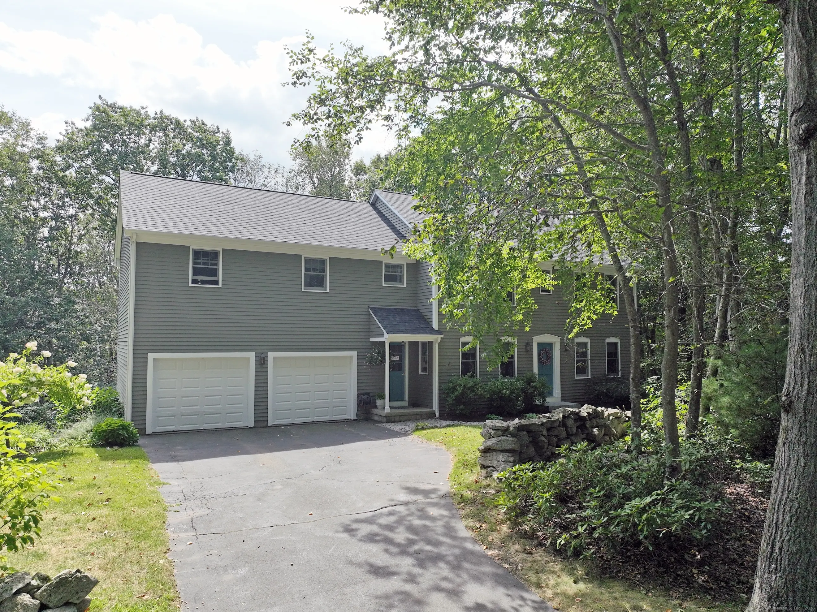 Nestled at the beginning of a quiet cul-de-sac and surrounded by mature trees and classic stone walls, this beautifully maintained 3-bedroom, 2.5-bath custom Colonial offers peace, privacy, and timeless appeal on nearly 2 private acres. Designed by the original owners with quality and comfort in mind, this home features a thoughtfully laid-out floor plan, sun-filled living spaces, and a host of modern updates-including a new roof (2024). The spacious kitchen showcases elegant soapstone countertops, a large center island, and French doors leading to a bright sunroom with beautiful views of the landscaped backyard. The open-concept family room flows seamlessly from the kitchen and features a Vermont Castings wood stove insert, custom wood-accent wall, and a cozy window seat beneath a striking Palladian window. Upstairs you'll find three generously sized bedrooms, a convenient second-floor laundry room with sink, and a separate home office. There's also access to a large walk-in attic with heat and expansion potential-ideal for a future fourth bedroom or man cave. Perfect for pet lovers, the home includes a built-in dog bed, a cat entrance and a full-property invisible fence. The partially finished walkout lower level includes a home gym, rock climbing wall, workshop, and abundant storage. Located in a desirable neighborhood near the Marlborough/Hebron line and part of an award-winning school district.