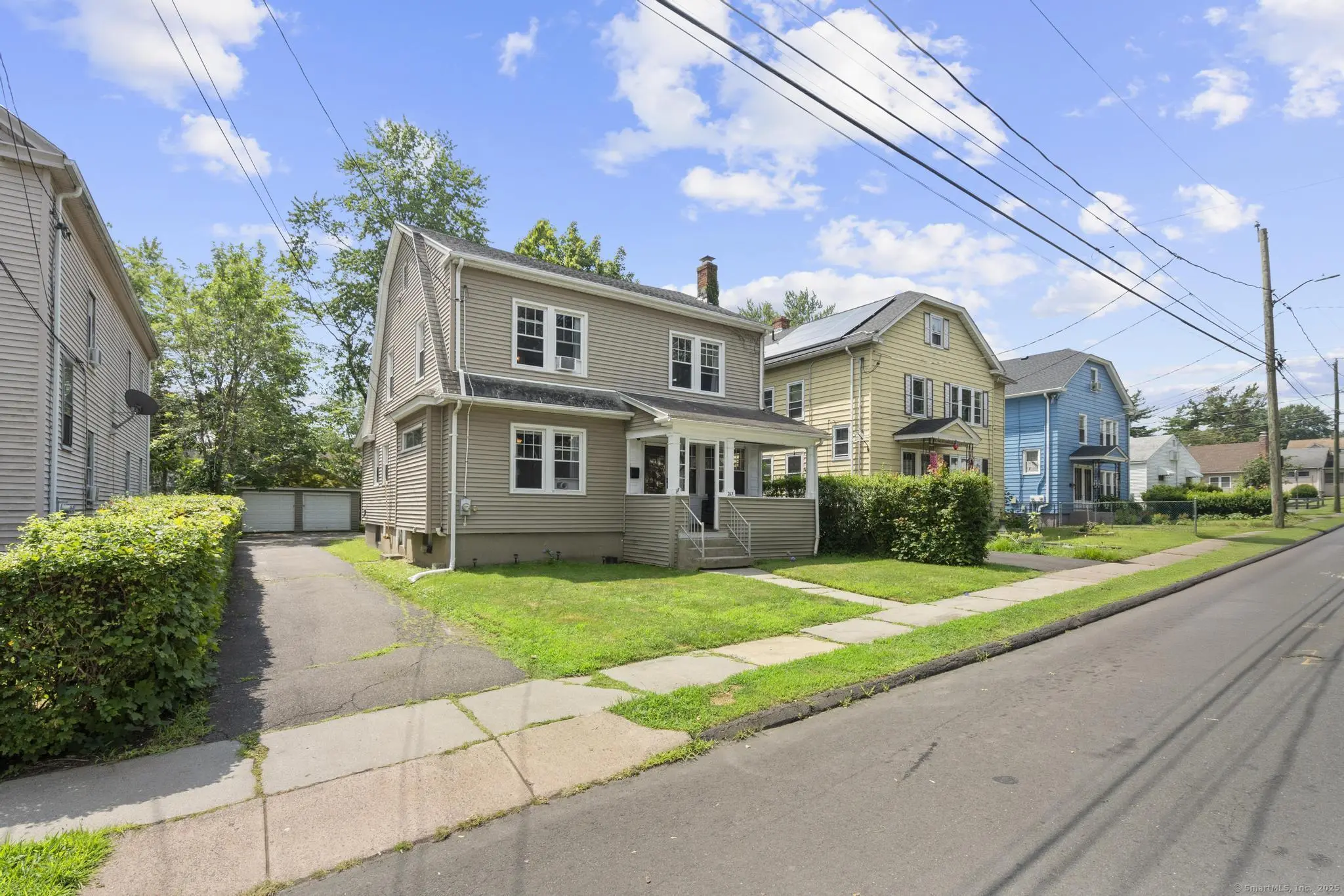 This charming colonial boasts lovely curb appeal, highlighted by a welcoming front porch. The first floor features an open layout with living room, dining room, and an eat-in kitchen. A versatile bonus room off the living room offers flexible space for an office, playroom, or additional living area. Throughout the first floor, you'll find beautifully refinished hardwood floors. The kitchen is nicely remodeled with plenty of room for an eating area, an island, newer appliances, and an updated aesthetic. A convenient half bath is also located on the main level. Upstairs, the second floor provides three generously sized bedrooms, all featuring nicely finished hardwood floors and abundant natural light. A full, remodeled bathroom with a tub completes the second floor. Outdoor amenities include a back deck perfect for dining, relaxation, or entertaining, along with a small yard. The property also benefits from a two-car detached garage and a private, paved driveway. Conveniently located, this home is just minutes from Newington and Wethersfield, as well as Goodwin Park Golf Course and Park, with easy access to major highways for effortless commuting.