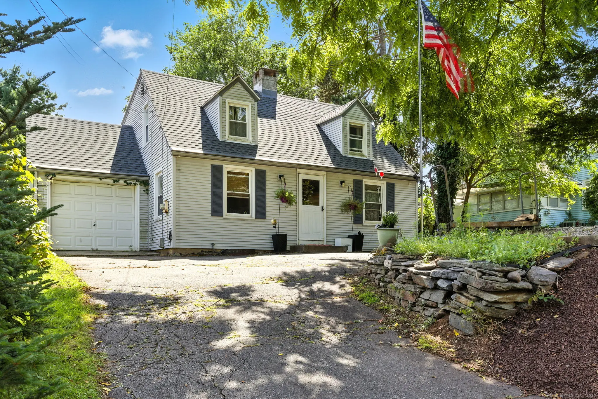 SWEET 2-3 bedroom, 1.1 bath fully dormered Cape with great bones and TONS of potential. The first floor features a front-to-back living room with a brick fireplace and coffered ceiling, a formal dining room open to the large kitchen, and an office (town calls it the 3rd bedroom) with a powder room. Upstairs, you'll find a large primary bedroom, additional bedroom, and a full bath. Oak floors throughout most living areas. The full basement is half finished / half utility. BRAND NEW architectural roof. Natural gas heat via updated Crown boiler. This cutie sits on nearly a quarter acre with a flat, private backyard and has grape vines, and fruit trees!