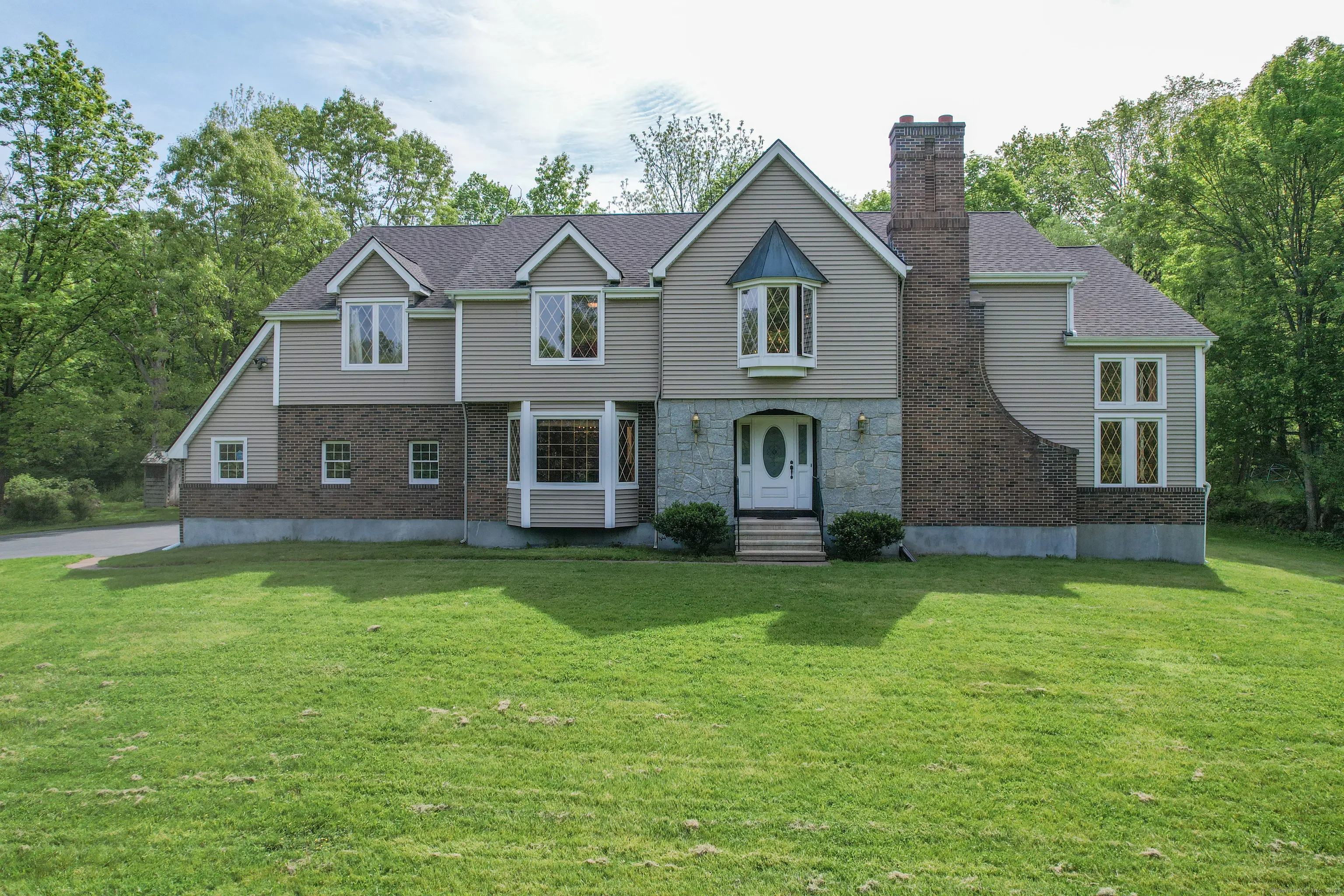 You'll be captivated the moment you pass through the stately stone pillars + approach this stunning grand colonial, set on a picturesque lot in one of Southington's most desirable areas. Surrounded by mature trees + lush lawn, this home offers timeless elegance, unmatched privacy, and the feel of a private estate. Step into a dramatic 2-story foyer with gleaming HW floors flowing throughout. Formal living room boasts a striking stone fireplace, soaring vaulted ceilings, ceiling fan + 2-story windows that flood the space with natural light. Just a few steps down, the sunken family room offers a cozy retreat with a Palladian window, vaulted ceiling, + ceiling fan. A versatile adjacent room is perfect for a home office. Formal dining room impresses with beautiful moldings + large picture window, leading into a spacious kitchen featuring plenty of cabinets, eat-in area with access to a future deck, + mudroom with laundry + utility sink. Luxurious primary suite includes vaulted ceilings, dual walk-in closets, + a spa-like bath with jetted tub, shower, + dual vanities. 2 additional bedrooms share a Jack-and-Jill bath with double sinks. 2nd-floor laundry adds convenience, with potential nursery space. Access spacious lower level through the 3-car garage or off kitchen entrance. Lower level is the perfect workshop area + can be easily finished. Extras: generator hookup, central AC, dual furnaces, whole house attic fan, + security system. Classic charm and modern comfort at its best!