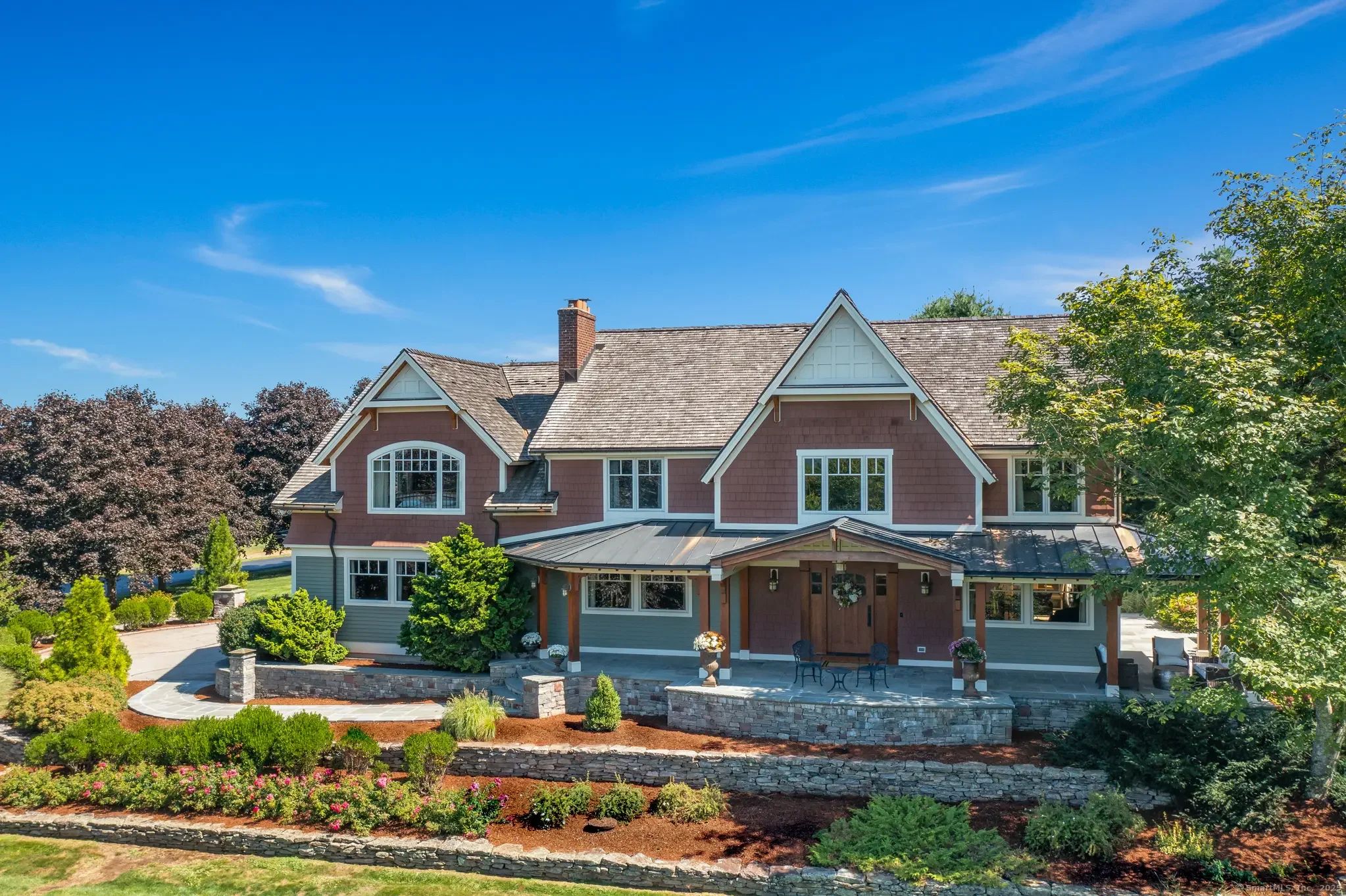 ENCHANTING....It's THE ONE you've always admired, nestled in a most coveted, tranquil setting amongst the bucolic hills and orchards of South Glastonbury. Every room a masterpiece, every window a canvas displaying captivating VIEWS of lush, colorful gardens, in-ground heated gunite pool, spectacular sunsets, and the ever- iconic Hartford skyline. The entire property is framed by a row of mature maple trees. The home has been extensively, lovingly renovated since 2006 and beyond, including the addition of a magnificent primary bedroom retreat featuring luxurious bath with French doors out to terrace, walk-in closets, 2- story vaulted ceiling, and Palladian window showcasing views of Hartford skyline and beyond. Each renovation was done with an eye toward incorporating natural elements into the design: handcrafted cherry entry door, inlaid wideboard wood and slate flooring in the foyer, magazine- worthy "beam and board" ceiling in the family room, a wall of hand hewn stone surrounding fireplace in the dining room, and a sweeping bluestone front porch with natural red cedar columns and ceiling. The gourmet kitchen, redone in 2024, boasts a walk-in pantry, quartz countertops, custom built-ins and stunning eat-in area. It is framed by walls of windows ushering in tons of natural light and inviting backyard views of pool, bluestone patio and pergola. Entertaining is a breeze with a wonderful, open layout welcoming family or guests into spaces that are both functional and fun...