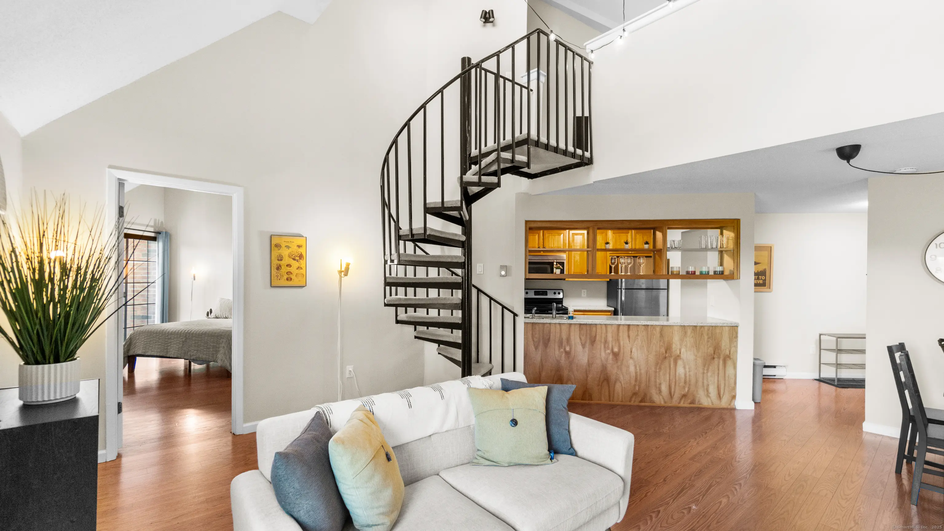 Live in the heart of West Hartford Center! Nestled within The Mews community, this spacious unit offers the perfect blend of modern convenience, comfort, and an unbeatable location. Move right into this fully furnished, top-floor condo in one of the most desirable spots in town - just steps from Blue Back Square, restaurants, shops, entertainment, and more. Inside, you'll find a bright, open layout designed for comfortable living. The main level features a kitchen, living room, and large primary bedroom, all on one floor. A spiral staircase leads to an upper-level bedroom with a full bathroom, creating a flexible living space. Enjoy balconies off both the living room and main-level bedroom. Additional features include electric baseboard heating, a convenient wall-mounted cooling unit, and a coin-operated common laundry area on-site. Maintenance of grounds, trash and snow removal, and water are included, with HOA covered by the owner. Living at The Mews means having the best of West Hartford right at your doorstep - from dining and movies to the library and local events. Experience low-maintenance living in a location that's hard to beat!
