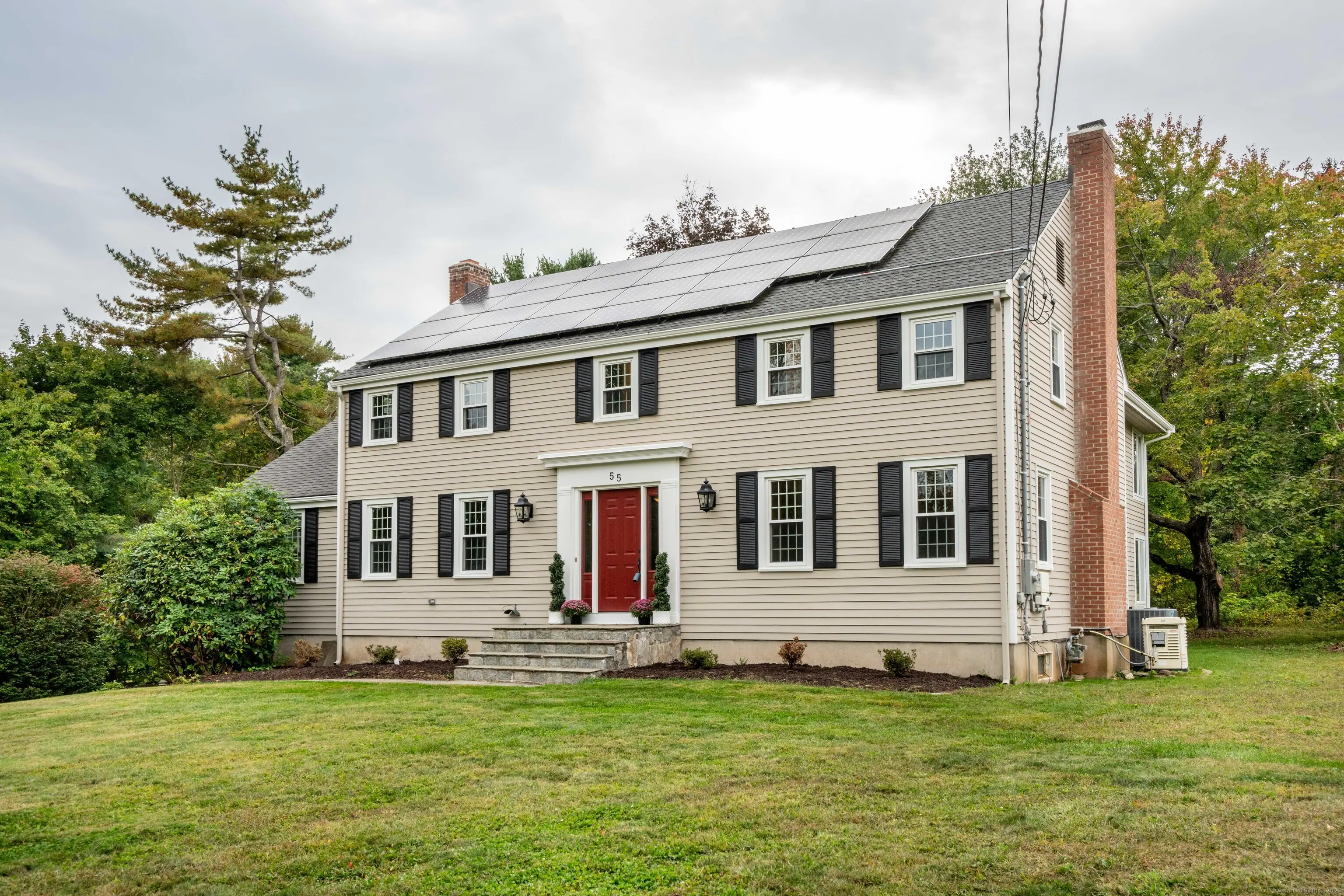Welcome to 55 Musket Trail, set in one of Simsbury's most popular neighborhoods with access to top rated schools nearby, as well as Rails-To-Trails for outdoor enthusiasts, the Farmington River & state parks for nature lovers. An easy commute to downtown Hartford with the tranquility of a tree-lined community to return to at the end of the day. This home has some rarely found features such as an open layout from the updated kitchen to the family room surrounded by windows to the upper level loft which feels like a tree house! Natural gas heating along with the fully owned solar panels allowing the electric bills to be under $10/month!! Updates include the roof in 2018, c/air on the upper level & new mini-splits on the main floor in 2025, electrical panel upgrade in 2025, & wood floors refinished in 2025. The spacious & private office/study on the main floor offers a fireplace & built-ins & is large enough for multiple work spaces. Just minutes from the iconic Simsbury Farms recreation area for summer swimming, golf, pickle ball, & tennis & winter ice skating or sledding. With downtown Simsbury close by to enjoy community events such as Septemberfest & summer concerts, this location offers an unmatched blend of lifestyle, convenience, & small town charm.